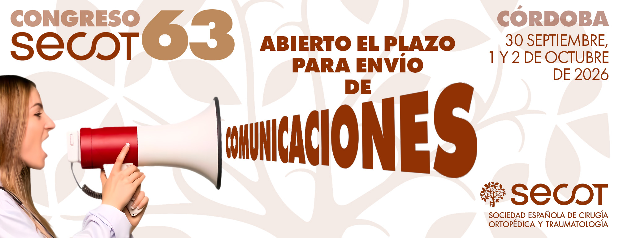 El Comité Científico del 63º Congreso Nacional SECOT, a celebrarse en Córdoba los días 30 de septiembre, 1 y 2 de octubre de 2026, le invita a participar con la presentación de comunicaciones orales y/o pósteres. Como todos los años, se concederán premios a los mejores trabajos.